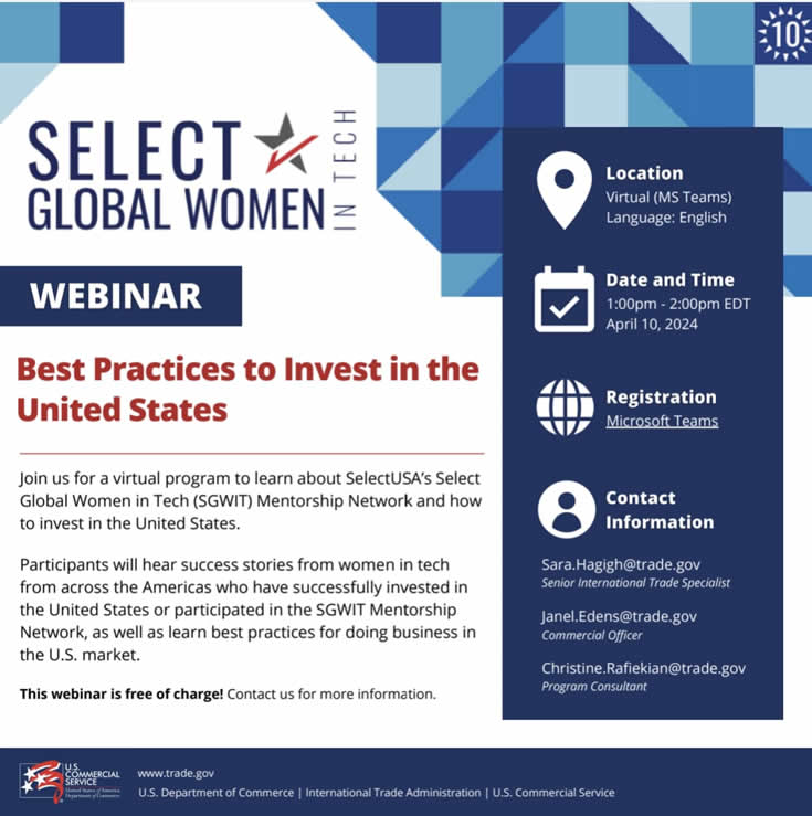 She will lead this panel of professionals who will talk to us about investment opportunities in the United States, as well as business expansion for women in the technology sector.